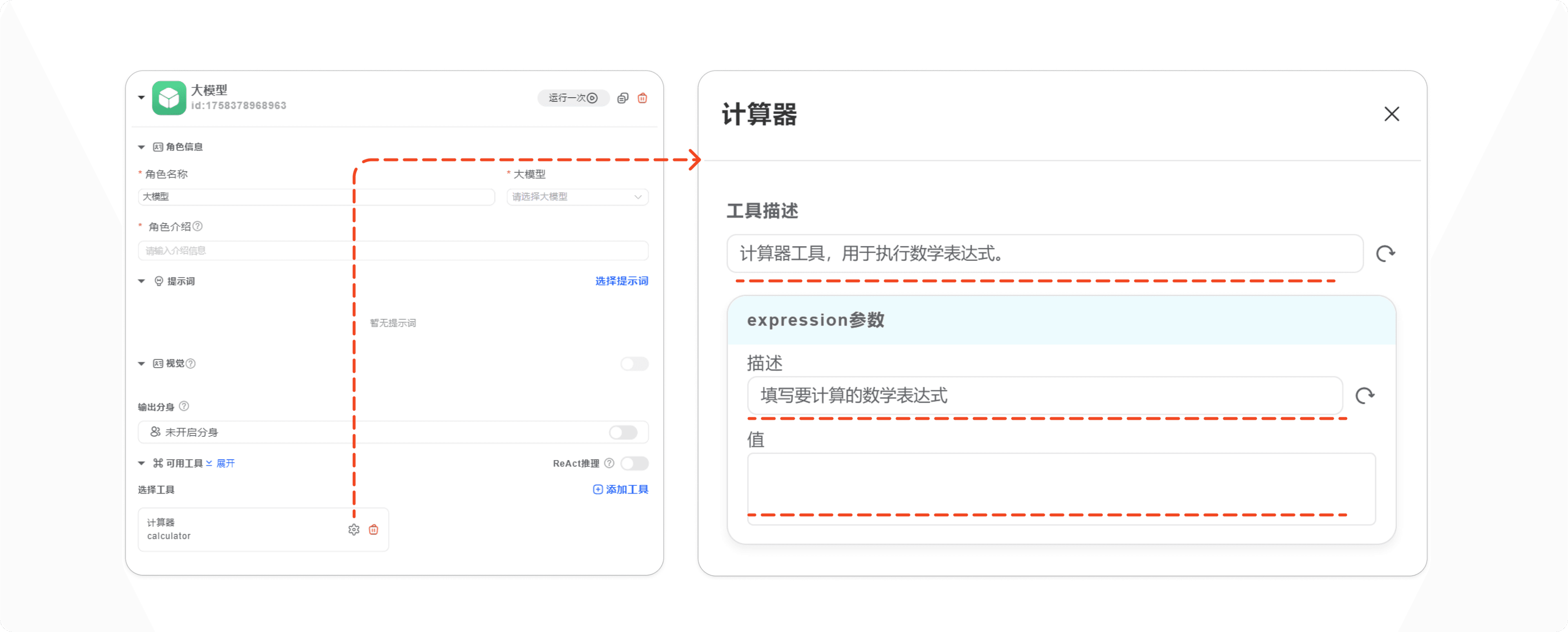 - 填写固定值:工具将固定次参数的值,流程运行的时候,将不会改变,模型也不会填写此参数。