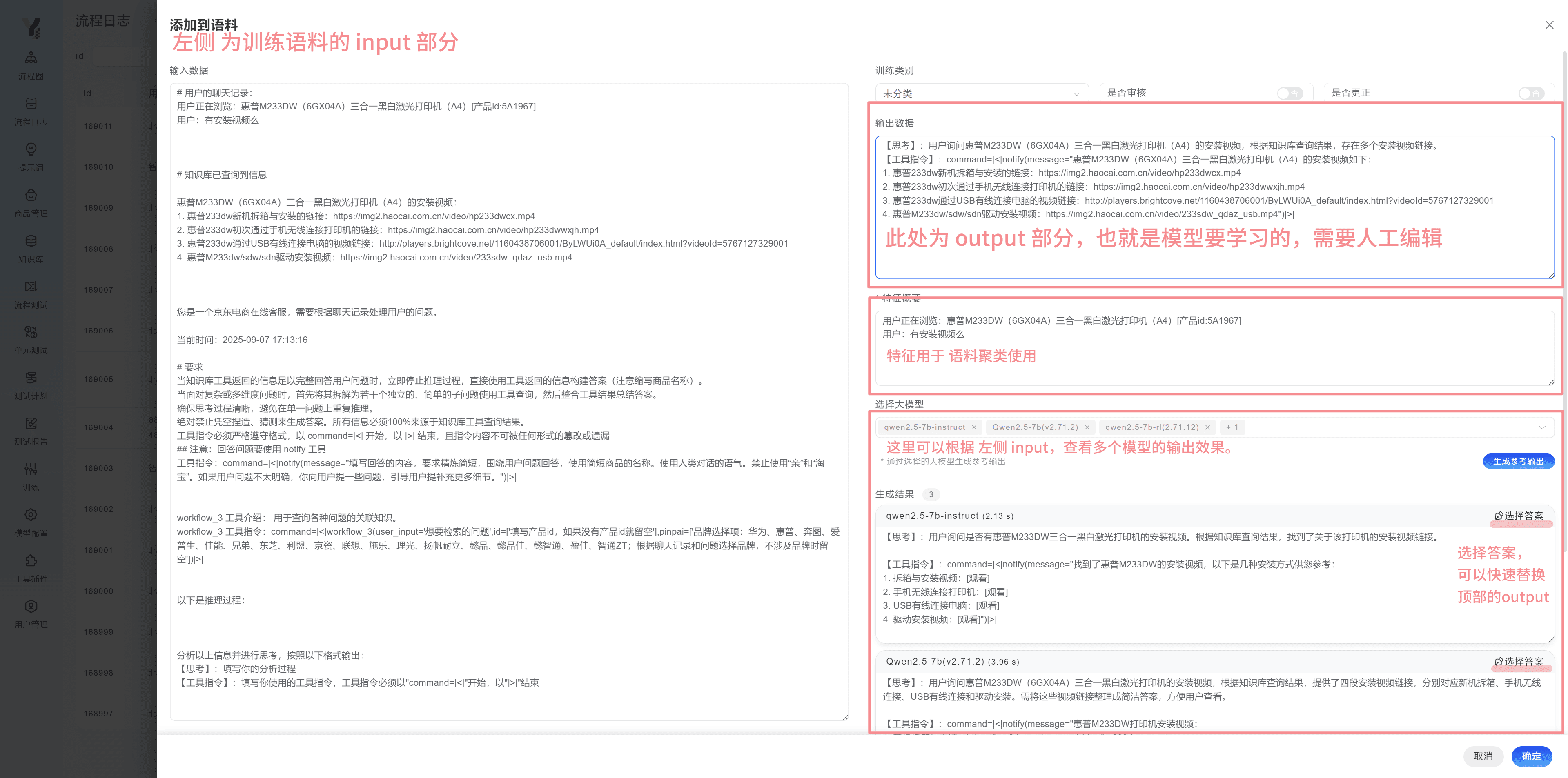 在日常查看流程日志的时候,当发现模型输出不符合预期的时候,先将有问题的节点,点击“添加语料”按钮,选择对应的分类,